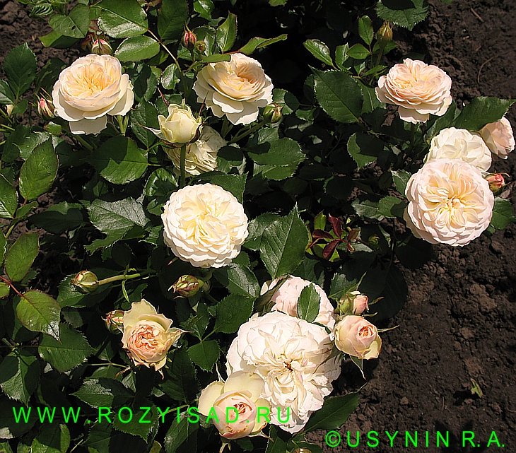 Описание: Кусты компактные, ветвистые, заканчивающиеся соцветиями от 3 до 8 шт. Высота кустов 60-80 см., шириной 40 см. Цветы чашеобразной формы (диаметром 6-9 см.), долго не увядают, густо-махровые. Бутоны кремово-белые, потом цветы розовеют и к концу цветения белые. В зависимости от погоды может появляться розовая кайма. С приятным ароматом. Цветет обильно. Рекомендуется для посадки небольшими группами. Можно выращивать в контейнерах. Имеет медаль «Золотая Роза» в 2003г. в Баден-Бадене.